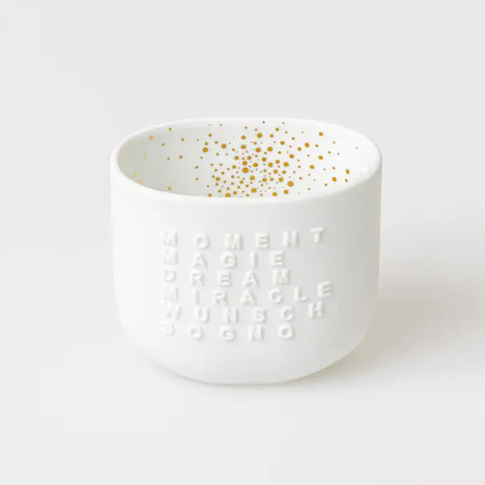 - Design: Weißes Porzellan mit goldfarbenem Punkt-Akzent („Goldener Punkt“) – das Motiv „Moment, Magie, Dream“ steht für kleine Lichtmomente in Alltag & Fest.