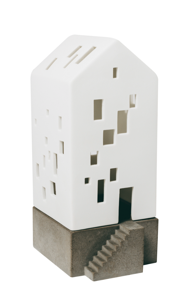 Das Lichthaus mit Betonsockel „Kleines Apartmenthaus“ vereint modernes Design mit warmem Lichtambiente. Der stabile Betonsockel verleiht dem Porzellanhaus eine besondere Präsenz, während feine Fensteröffnungen das Licht eines Teelichts oder einer LED sanft nach außen tragen. Ob als Blickfang auf dem Sideboard, Fensterbrett oder in einer Lichthaus-Szenerie – dieses Objekt verbindet Architektur und Stimmung.