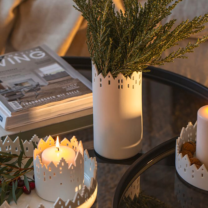 Schaffe in Deinem Zuhause einen stimmungsvollen Blickfang mit der "Stadtvase“ von Räder. Diese elegante Porzellan-Vase kombiniert modernes Design mit feiner Architektur-Ästhetik und bringt Licht und Blumen stilvoll zusammen.