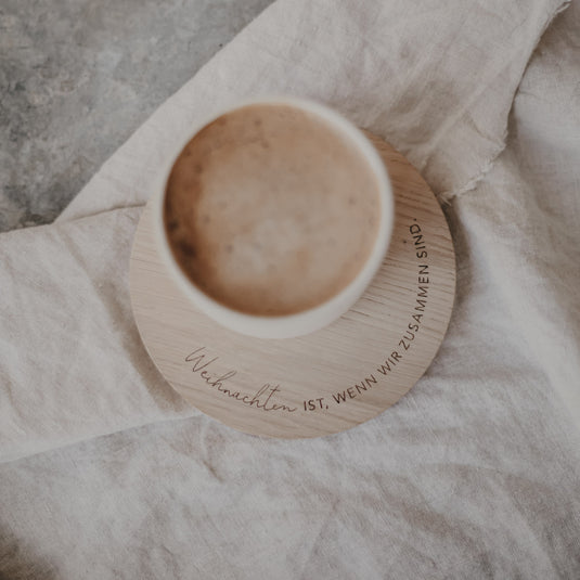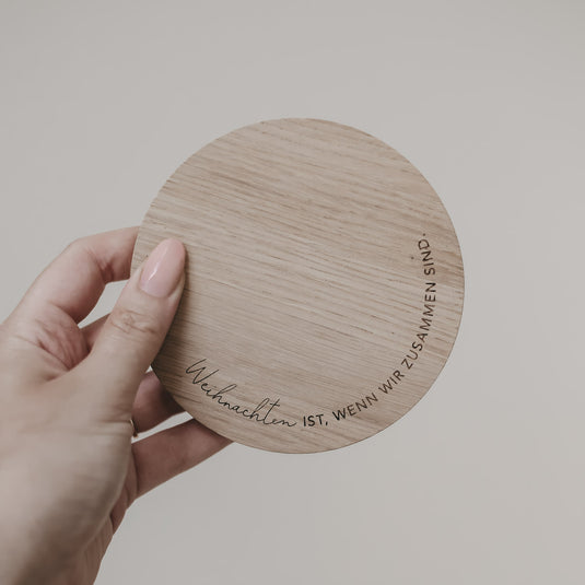 - Material: Eichenholz mit Lasergravur „Weihnachten ist, wenn wir zusammen sind“ auf der Vorderseite; Rückseite ebenfalls mit feiner Gravur.
